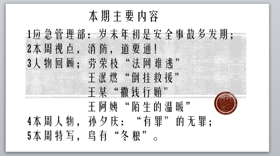 本期新闻台由19麻醉1班承办,新闻周刊从消防通道的问题出发,再次强调了消防安全的重要性。本周人物,我们从王某和劳荣枝的事件中认识到违法之事不可为,从王泯燃和王阿姨的事件中又体会到了人心的温暖。