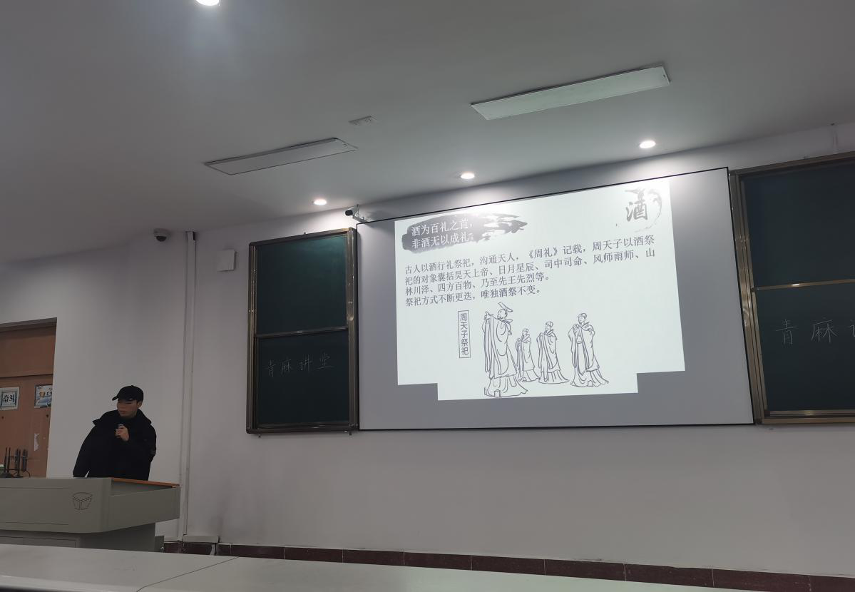 本期“青麻学传统”由19麻醉2班沈栋同学向大家介绍中国的酒文化。酒是人类生活中的主要饮品之一。中国制酒历史源远流长,品种繁多,名酒荟萃,享誉中外。他依次向同学们介绍了酒的历史和“酒”文化背后的深远涵义,“酒为百礼之道,非酒无以成礼”,酒和文化艺术、人生大事婚丧嫁娶息息相关,酒也是传情达意的最好媒介,酒促诗境,诗成酒意,韵味悠远,内涵十足。同学们在沈栋同学的介绍中也感觉到了回味无穷。最后,本期青麻学传统以一曲豪迈快意的《大氿歌》作为结束。