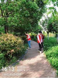 主要负责清理山顶小亭与小广场的垃圾,清理小路旁花坛中的杂草与垃圾,志愿者们认真清扫周边垃圾,不怕脏不怕累。清整过程中有人浑身沾满了尘土,有人的手被树枝扎破,但是大家仍然坚持清整,干劲十足、信心满满,认真负责的完成了自己的任务。经过大家的共同努力,绿化带里的垃圾被清理得干干净净,公园内卫生死角堆积的垃圾一扫而空。真正体现出青年志愿者敢担当、能吃苦的奋斗精神!经过16点到18点两个小时的努力,同学们手中的袋子里都有了不少垃圾。虽然已是下午十分,天气依旧十分炎热,同学们没有丝毫抱怨。结束时,大家在山上的亭子前集合,一起拍照记录此次很有意思的活动。