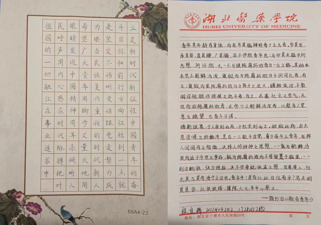 此次活动同学们积极提交了297份作品,作品分为硬笔、软笔,内容也极其丰富,包括习近平总书记寄语青年的语录、与五四精神有关的诗句、名言警句、文学摘抄、同学们对于青春奋斗的感想以及结合主题创作的文章等。作品的字里行间都彰显了青春与热血、体现了同学们的志向理想及风采风貌。